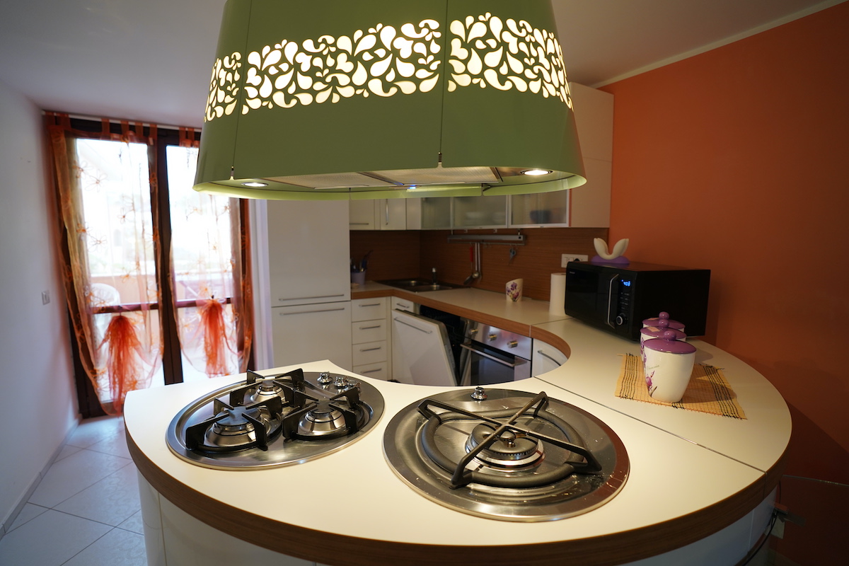 Nella zona giorno comodo divano con letto matrimoniale, cucina completamente arredata di tutto il necessario più tavolo per 4 persone.