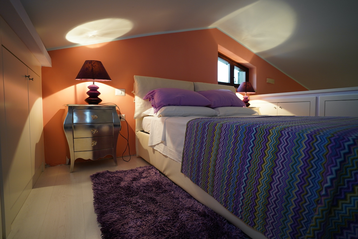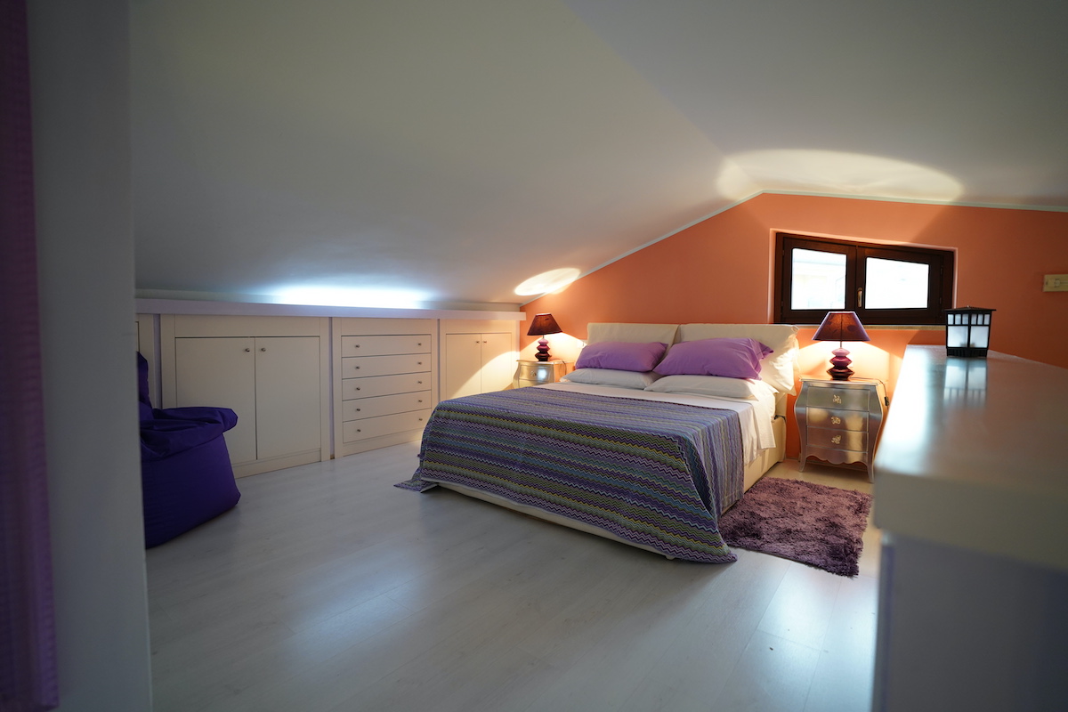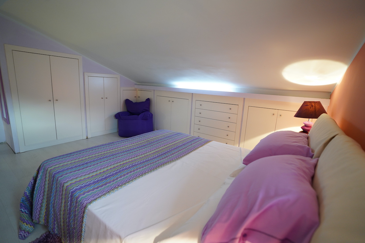 Camera da letto sul soppalco altezza normale con letto a due piazze più ampi armadi.